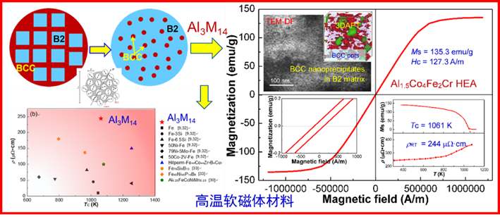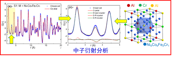 马跃博士根据中子衍射实验,验证了团簇结构理论模型,证实了高熵合金中化学短程序的存在,并建立了Al-Ni-Co-Fe-Cr多主元高熵合金的团簇式成分设计方法对BCC/B2共格组织进行调控,获得了高组织稳定性的方形与球形纳米粒子共格析出的高熵合金,实现了高熵合金结构性与功能性一体化设计,为发展新型高性能高强和软磁合金提供了全新思路。