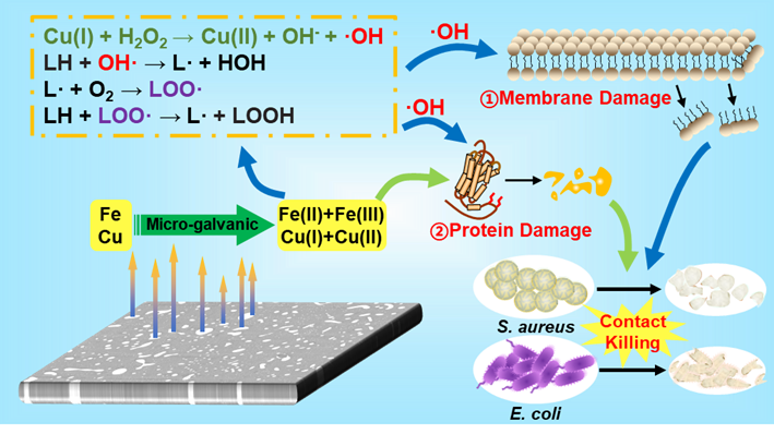 任广宇硕士通过多主元合金设计理念,成功开发了多种兼具优异力学性能和耐腐蚀性能的抗菌高熵合金,并揭示了其杀菌机制和强韧化机制。其不仅抗菌材料的开发提供了新的思路,更为高熵合金在抗菌材料领域的工程化应用奠定理论和实践基础。