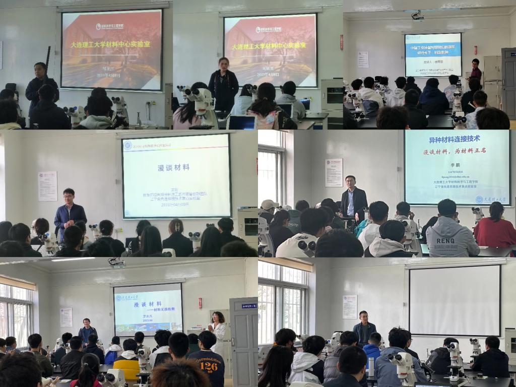 在“漫谈材料”沙龙环节。陈国清教授给每位学生发不同材料制作的样品,声情并茂地讲述金属制剑、高端陶瓷等样本,并引申材料未来的发展方向,鼓励同学未来改革创新,为中国材料行业做出贡献;王清教授以氛围轻松的互动方式,与同学们共同探讨有关规划、发展、专业、目标等话题,给予同学们思考的空间;康慧君教授以“材行天下,料定乾坤”主题,全方位向同学们讲述材料的内涵、大工材料的优势、学生培养模式、材料的研究方向以及发展趋势等;宋刚教授以“左右逢源,进退自如,顶天立地”定位材料专业,鼓励同学们积极尝试,发掘在材料中的兴趣点,勇于探索,潜心钻研;李鹏副教授简要介绍异种材料连接技术,并为大家排除关于材料专业的困惑,介绍焊接专业相关知识,以及焊接技术研究成果,坚定同学们学习材料的信心;罗忠兵副教授介绍材料学中的无痕检测技术,展示材料作为具有交叉学科特色的高精尖技术,在航空航天等诸多尖端领域的应用方面大放异彩;李鹏廷副教授着重介绍了传统材料中的金属材料,讲述目前航空航天、芯片等“卡脖子”技术所需材料的研究成果与进展;邹龙江主任介绍实验室总体情况,简要介绍实验室各个超百万大型仪器设备,以及学院的基本情况,说明了材料在大国重器的建造上有极其重要作用。