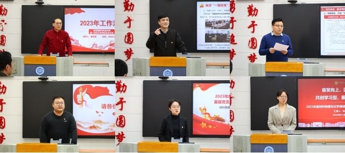 各党支部聚焦2023年度党建重点任务和推进“一融双高”建设情况、以及支部查摆问题整改情况、存在问题改进思路进行了总结。学院党委对照年初各支部提交《2023年基层党支部“一融双高”工作推进计划表》,在年末形成《2023年度党支部考核重要业绩指标一张表》,对支部工作进行督导。6名党支部书记进行现场述职,很好地展示了一年来支部以高质量党建引领学院高质量发展的良好势头。金属凝固与电磁控制第一研究生导师纵向党支部,面向青年教工,开启“薪火相传”活动扎实推进有组织科研,面向研究生,持续探索赛教融合育人模式。轻合金电磁改性研究生导师纵向党支部开创“党建文化与交叉学科创新培养融合”等系列特色活动,促进思政育人和科研攻关等融合建设;本科生辅导员纵向第三党支部努力打造“3+3+3”支部建设计划,建设乐于志愿、服务学科发展、创新争优的战斗堡垒;生物医用材料及智能材料博硕学生党支部持续六年如一日开展定期阅读好书分享,扎实提升党员团员理论水平;材料物理与化学博硕学生第一党支部持续开展志愿活动,接力大连站/大连北站节假日铁路志愿活动,支部全年志愿时长200+;材料物理与化学博硕学生第二党支部以“广度学习、深度思考、效度衡量”推动新拆分支部建设打下良好的基础。