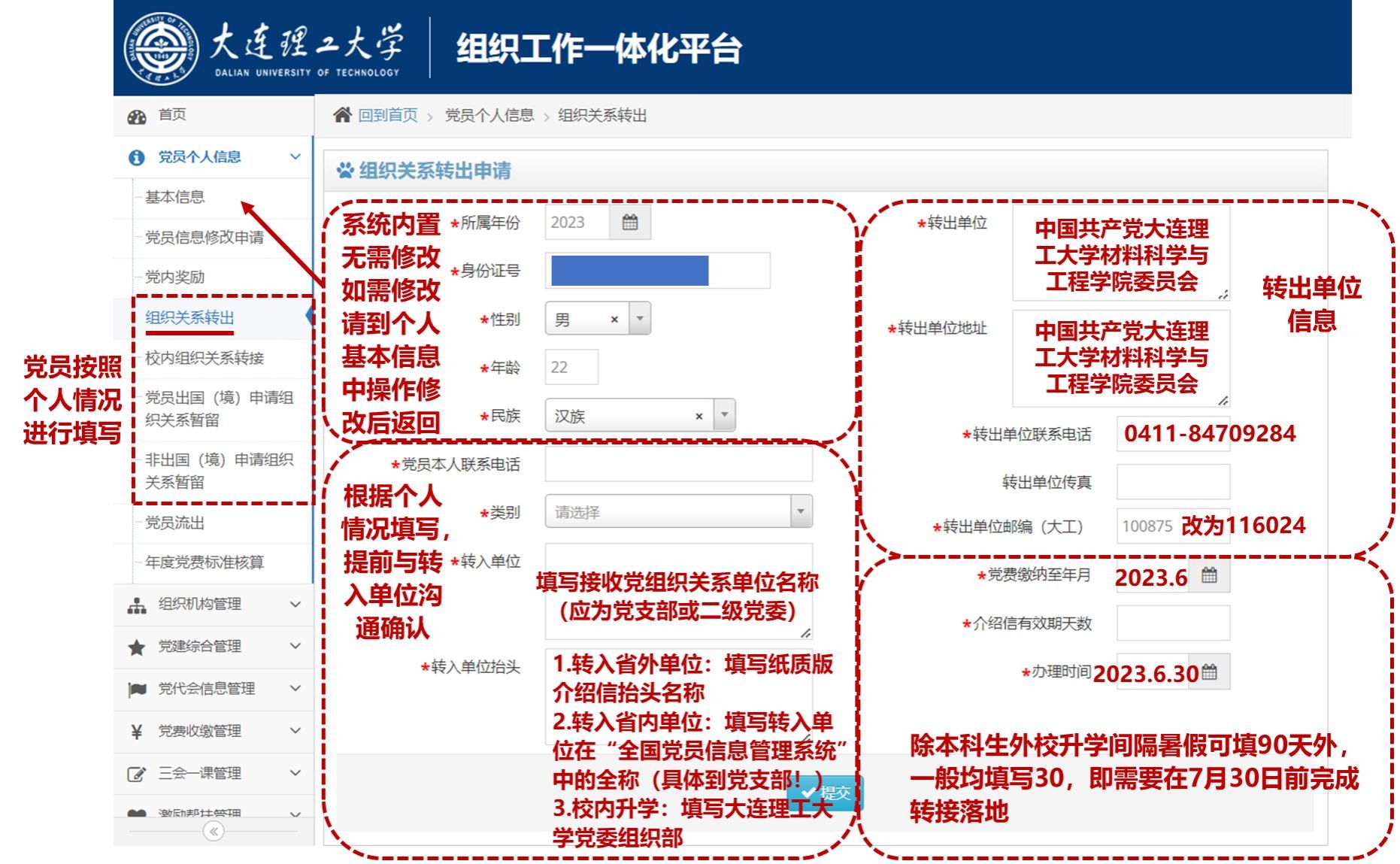 经支部批准后,党员本人需登录大连理工大学组织工作一体化平台(https://zzgz.dlut.edu.cn)提交组织关系转出申请(统一身份认证账号登录,“党员个人信息”-“组织关系转出”,详见下图),并填写“必威毕业生组织关系转接信息统计表单”(http://bestwishestoyou.mikecrm.com/6wEBzpo)。以上两项信息关系到组织关系能否顺利转接,支部需提醒党员提前与转入单位沟通确认无误。