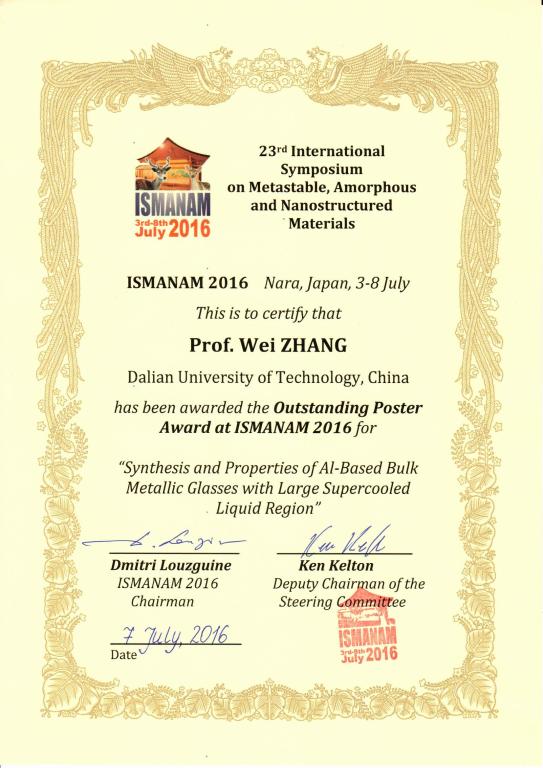 在海报展示环节,张伟教授课题组共发表了2篇会议海报,1篇为《Synthesis and properties of Al-based bulk metallic glasses withlarge supercooled liquid region》(陈思泉、张伟、朱正旺、李艳辉等),另1篇为《Novel soft magnetic Fe-Co-Ni-M high-entropy bulk metallic glasses》(李艳辉、张伟、齐天龙等)。这些研究工作得到了参会专家和学者的关注和好评。其中,第1篇关于Al基金属玻璃工作的海报荣获了本届会议“最佳海报奖”。