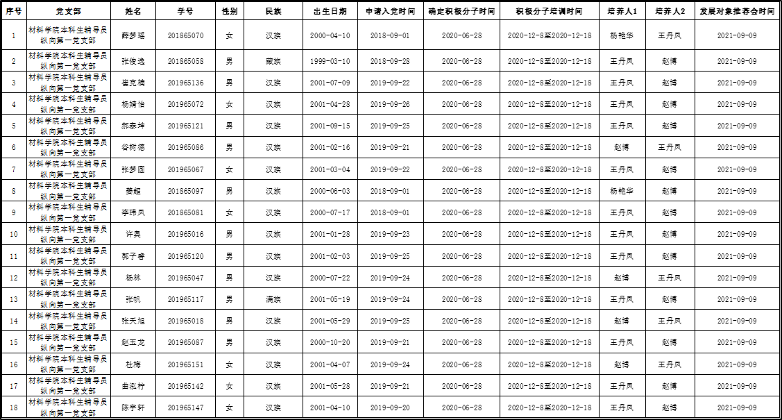 在听取党小组、培养联系人、党员和群众意见的基础上,经支部大会、支委会研究决定,拟确定薛梦瑶等18名同志为发展对象,具体情况公示如下。
